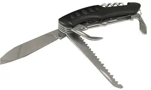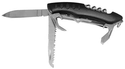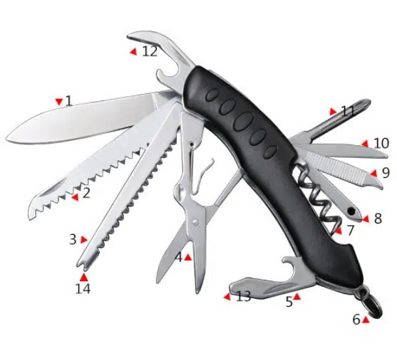 Kampçılıkta veya acil durumlarda kullanılmak amacı ile tasarlanmıştır. Gündelik hayatta anahtarlık olarak kullanılabilirÜrün MateryaliDış kasası plastik, fonksiyonları demirÜrün Boyutları9,1cm x 3,5cm x 1,7cmFonksiyon Listesi (2. resime göre)1. Bıçak (6,5cm)2. Testere3. Balık Pulu Soyucu4. Makas5. Gazoz Kapağı Açıcı6. Anahtarlık Halkası7. Tırbişon8. Güvenlik Paftası9. Törpü10. Sivri Uçlu Delici11. Tornavida Ucu (yıldız)12. Gazoz Kapağı Açıcı13. Tornavida Ucu (düz)14. Olta İğnesi Tutucu