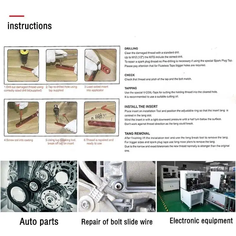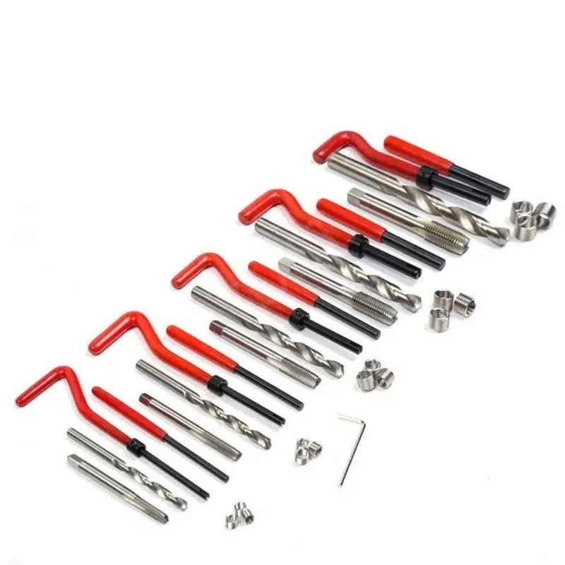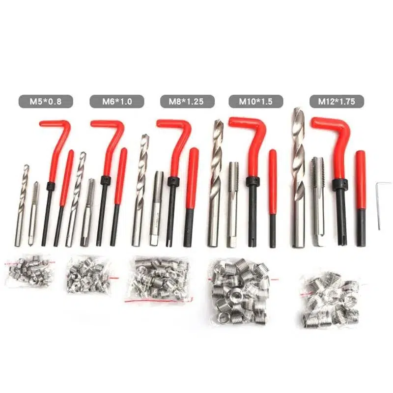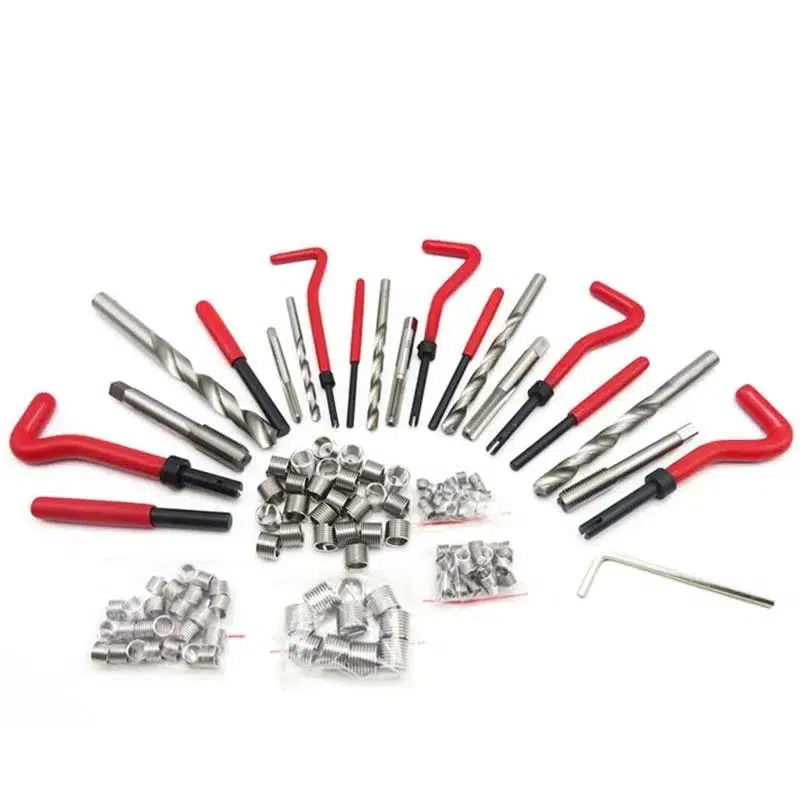 Bu tamir kiti insert kurulumları, tel iplik ekler, büküm matkap uçları, iplik musluklar, lug kırma araçları içerir.