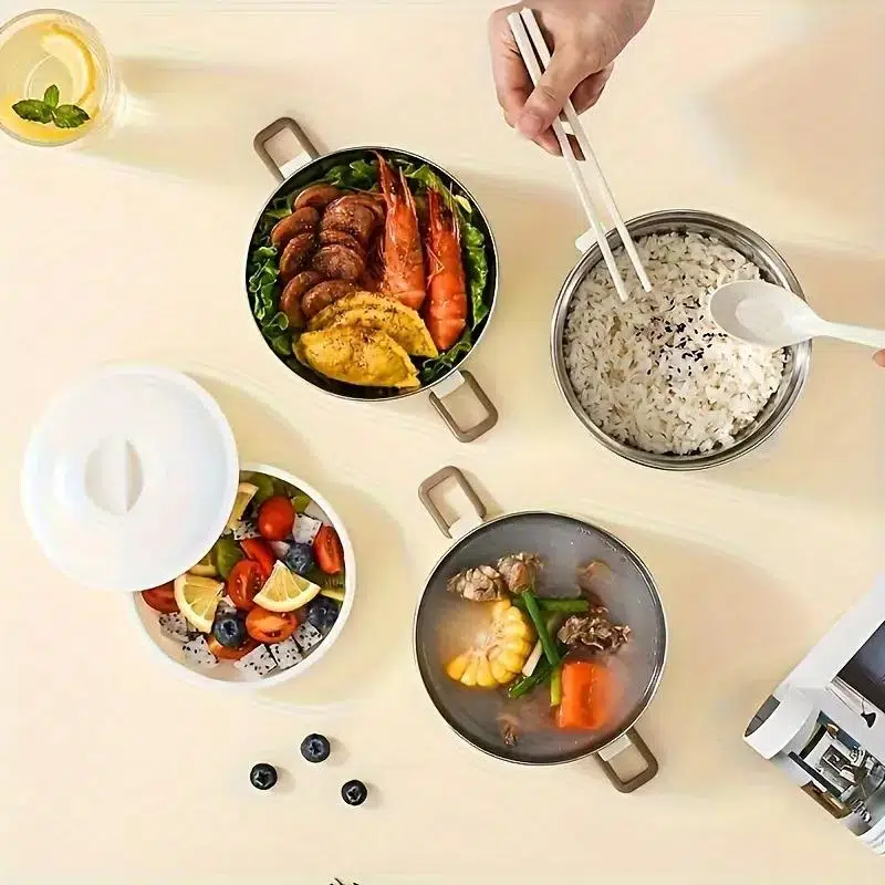 3 Gözlü Tasarım: Farklı yemekleri ayrı bölmelerde saklayarak taze ve düzenli taşımayı sağlar.