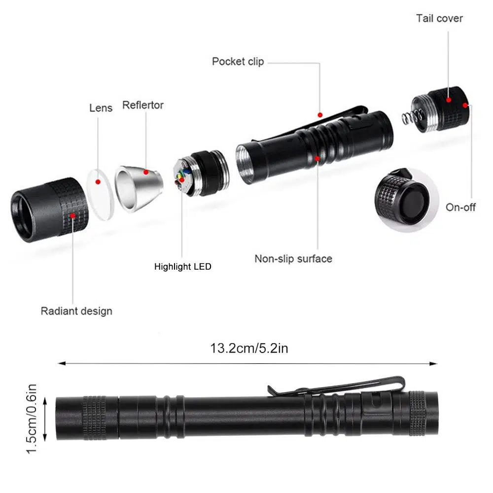 * Kompakt tasarım: boyutlu kalem gibi şekillendirilen küçük el feneri, taşınabilir ve çantanıza veya çantanıza kolayca sığabilen 13,2 cm uzunluğa sahiptir; El fenerinin kompakt boyutu avucunuza uyar ve farklı kişilerin çalışması için uygundur.