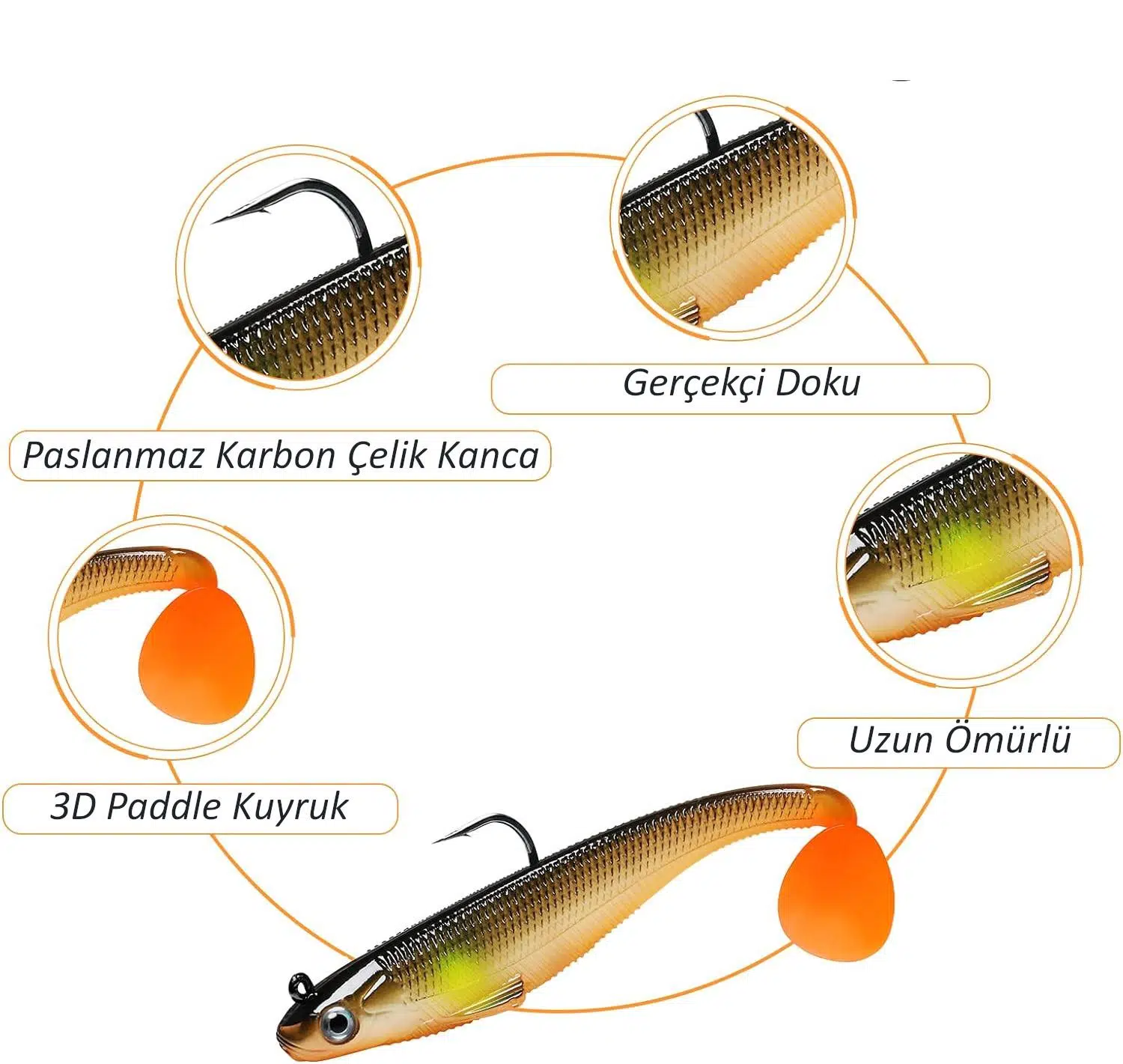 KALİTELİ MALZEME - yüksek kaliteli malzemelerden yapılmış, ustalıkla tasarlanmış ve ışık kırılma balık deseninin titiz testleri, "Shad Paddle Tail Bait" i daha gerçekçi ve çekici kılmaktadır. Canlı Japon tasarımına sahip yumuşak plastik balıkçılık yemleri, düzensiz yem balığı hareketini mükemmel bir şekilde taklit eder.