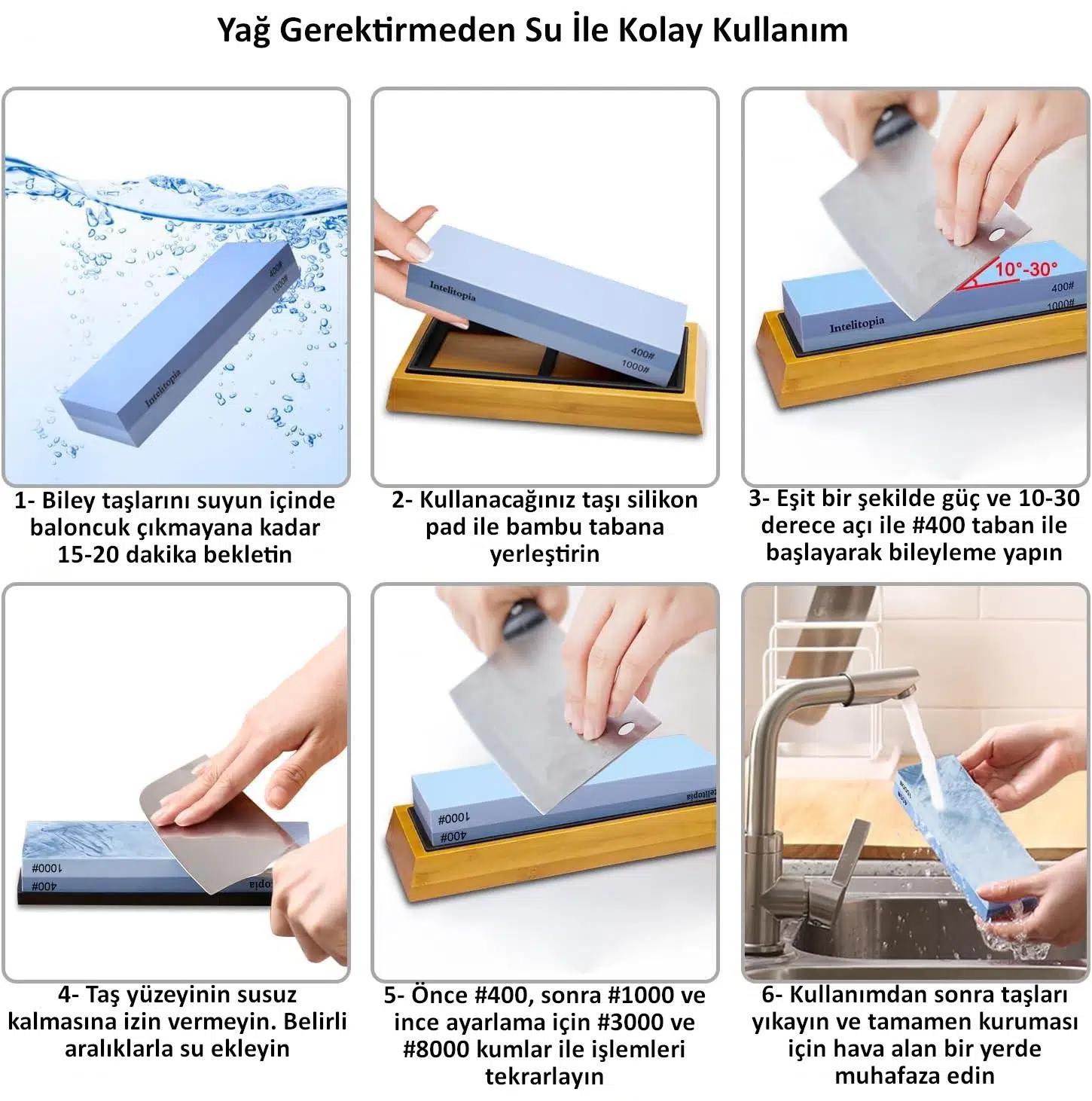 * Kullanımı Kolay: Whetstone bıçak bileyici su ile yağlanır, pahalı taşlama yağı gerekmez. Bileme taşını kullanmadan önce taşı 10-15 dakika kadar suda bekletmeniz gerekir ve kullanıma hazır hale gelir. Bileme taşı çatlamamalıdır. Bıçağınızı keskinleştirirken üzerine su ekleyebilirsiniz, suyun yağlama etkisi taşlama sonucunun daha iyi olmasını sağlayarak zamandan tasarruf etmenize ve bıçağın keskinliğini arttırmanıza yardımcı olacaktır.