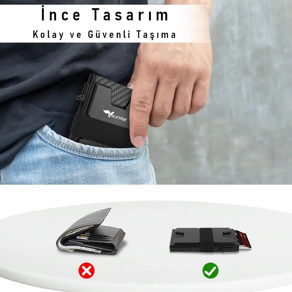 Geleneksel cüzdanların hantal yapısına son veren Valkyrie Akıllı Mekanizmalı Cüzdan ile tanışın! Şık karbon fiber kasası ve gelişmiş özellikleriyle hem tarzınızı tamamlar hem de günlük hayatınızı kolaylaştırır.