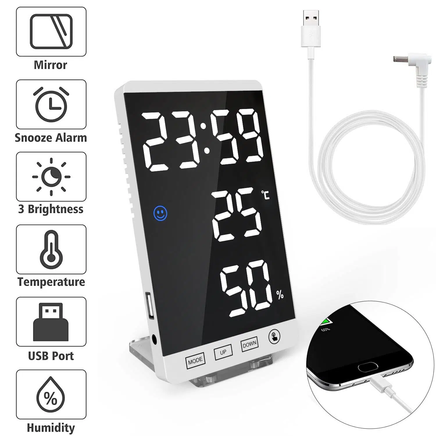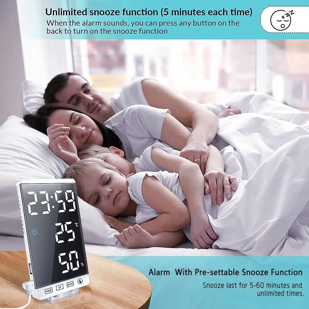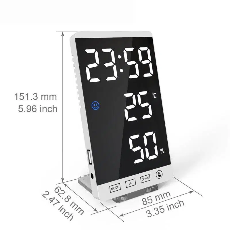 Valkyrie Aynalı LED Dereceli Nem Ölçer Alarmlı Masa Saati Beyaz