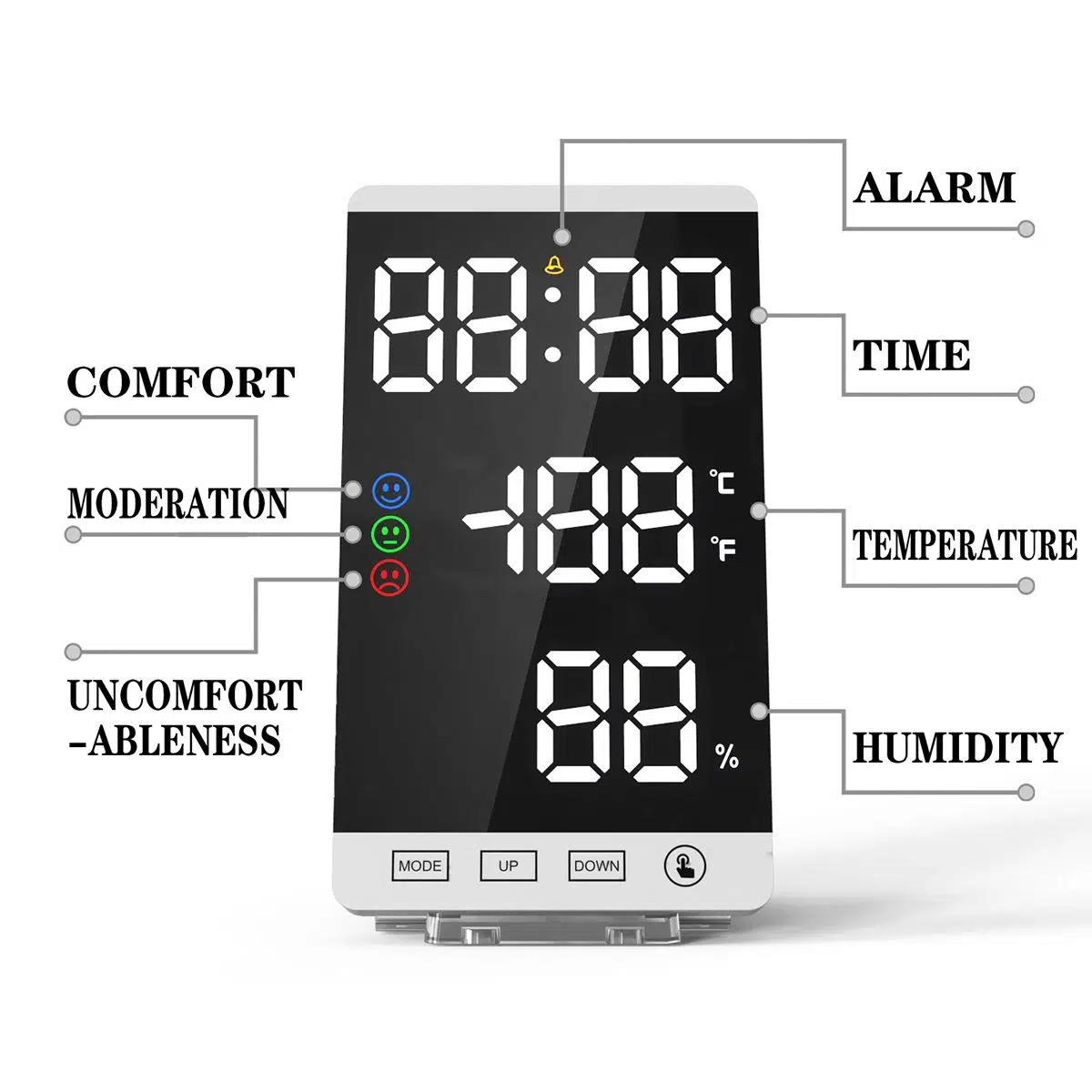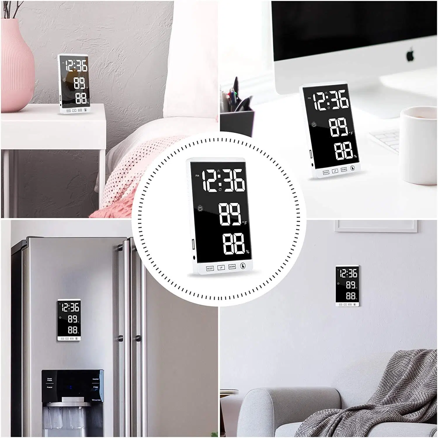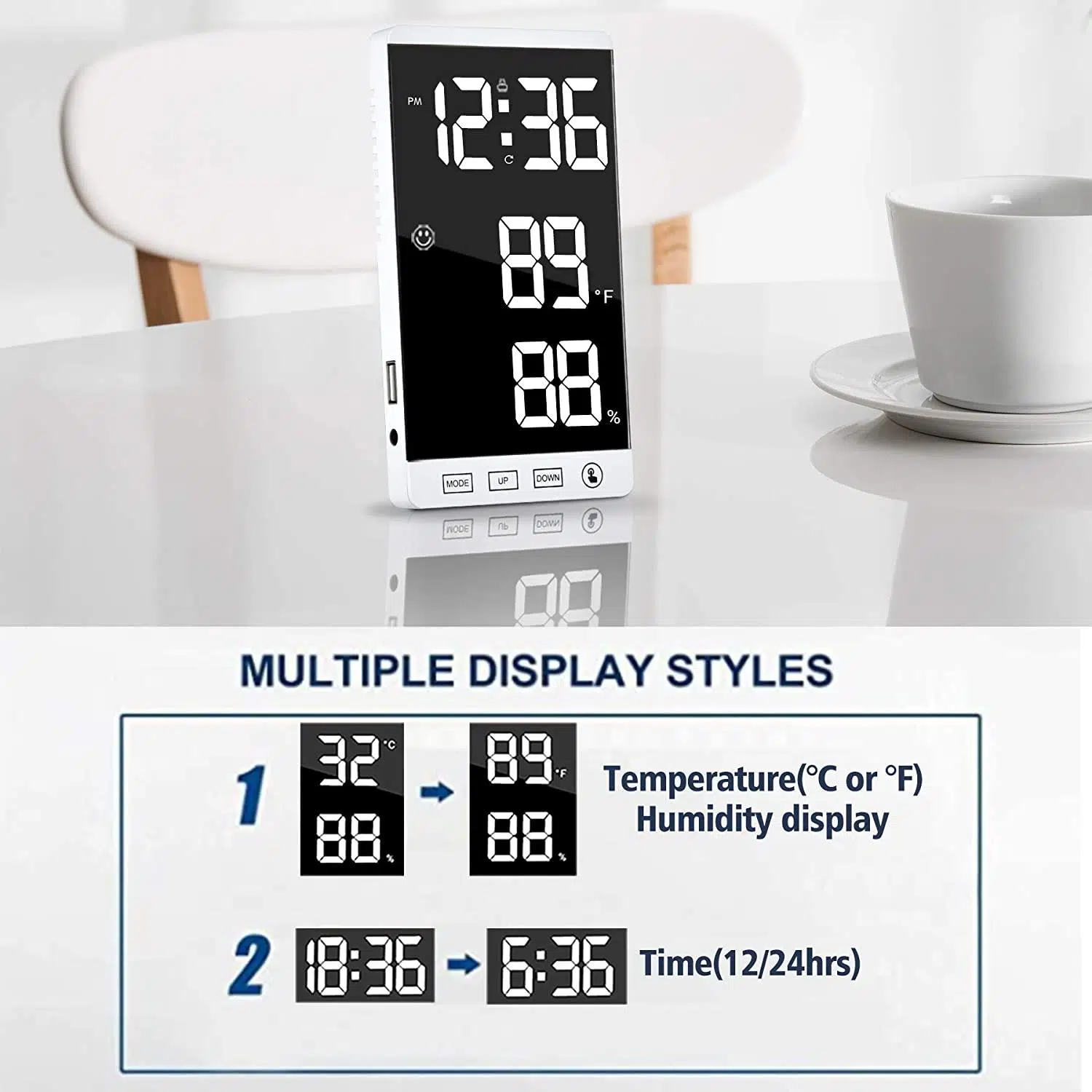 Valkyrie Aynalı LED Dereceli Nem Ölçer Alarmlı Masa Saati Beyaz