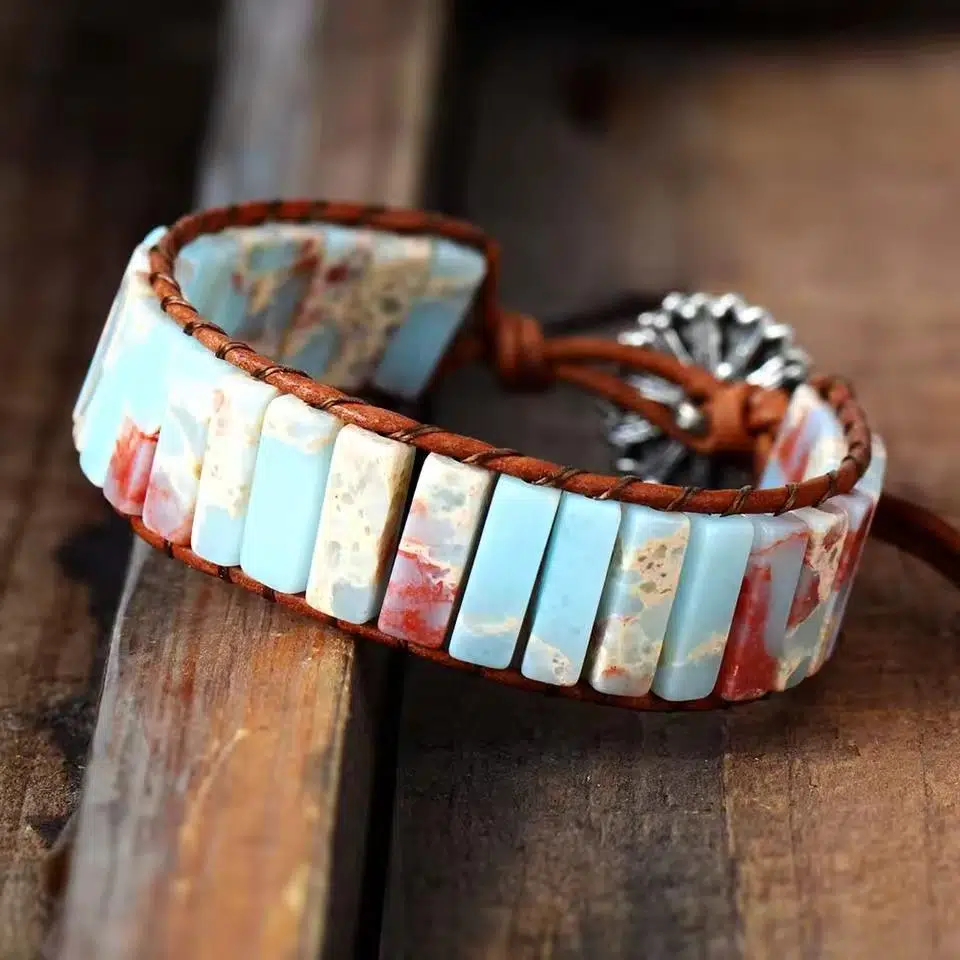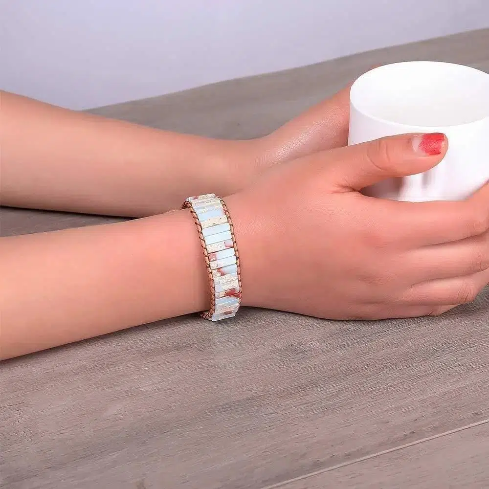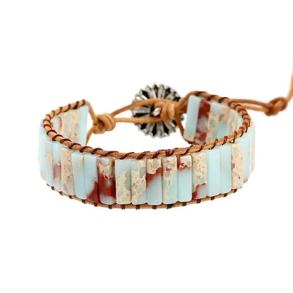 El işçiliğiyle tek tek örülen Amazonit taşları; açık mavi, krem ve kızıl tonların benzersiz uyumuyla bileğe şık bir dokunuş katar. Dayanıklı deri iplerle örülen tasarım, günlük kullanıma uygun uzun ömürlü bir yapı sunar. Ayarlanabilir yapısı sayesinde her bileğe tam uyum sağlar.