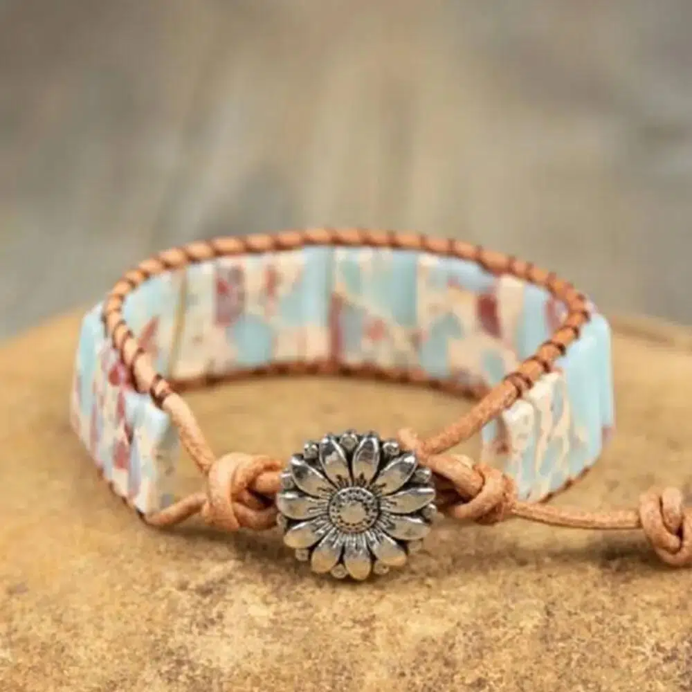 El Yapımı Amazonit Doğal Taş Bileklik – Ayarlanabilir Çiçek Düğmeli Tasarım