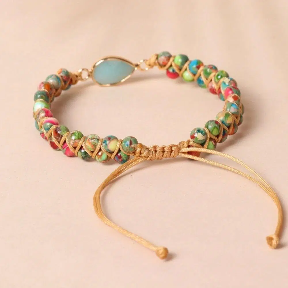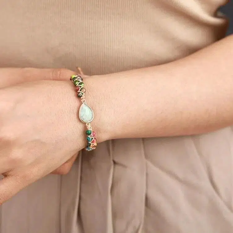 Tamamen el işçiliği ile hazırlanmış bu özel bileklik, renkli doğal taşların enerjisini su damlası formundaki merkez taşı ile birleştirir. Kadınlara özel tasarlanan bu model, hem günlük kombinlere hem de özel günlere zarif bir dokunuş katar.