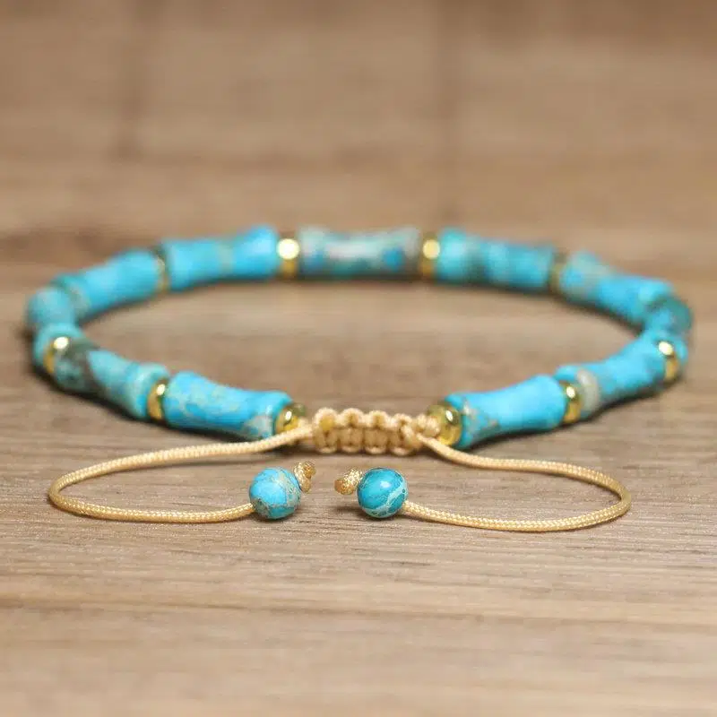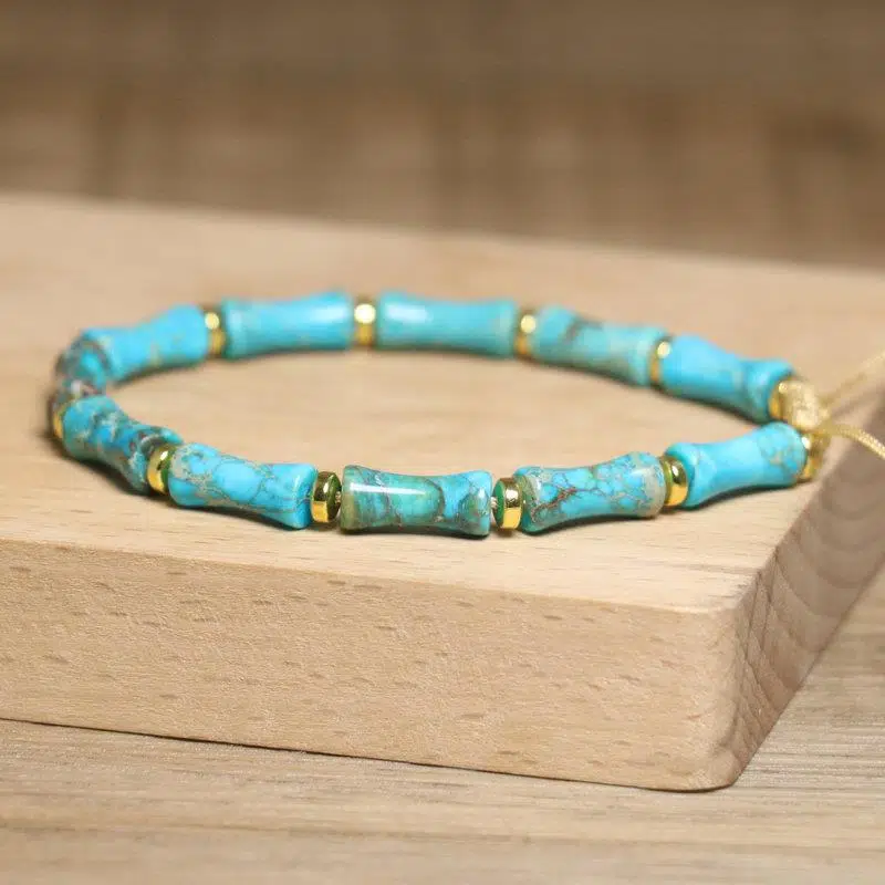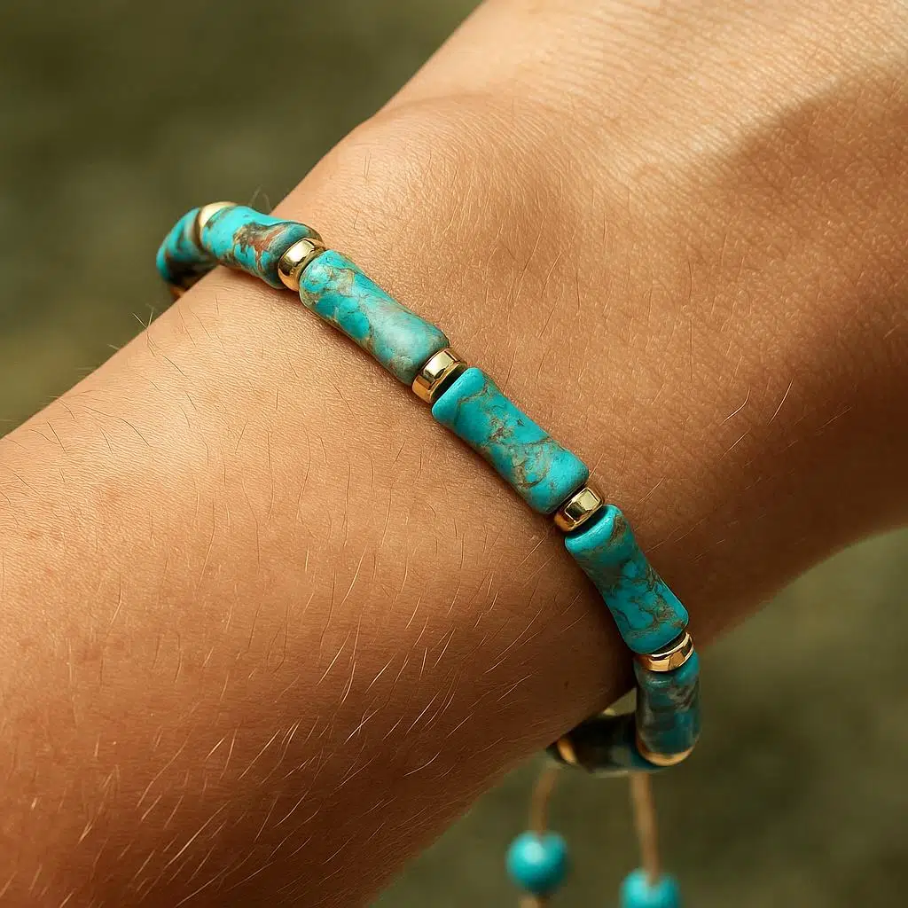 Valkyrie Doğal Turkuaz Taşlı Bileklik, el işçiliğiyle dizilmiş doğal turkuaz taşları ve altın detaylarıyla hem zarif hem de enerjik bir görünüm sunar. Turkuaz taşı, iç huzur, denge ve pozitif enerji sembolü olarak bilinir.