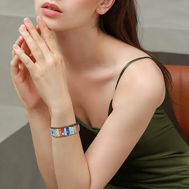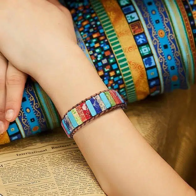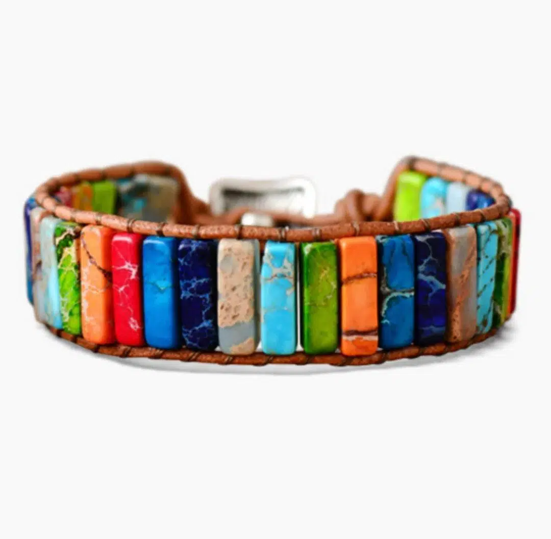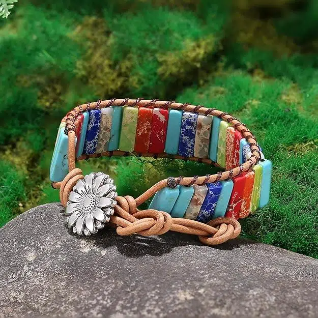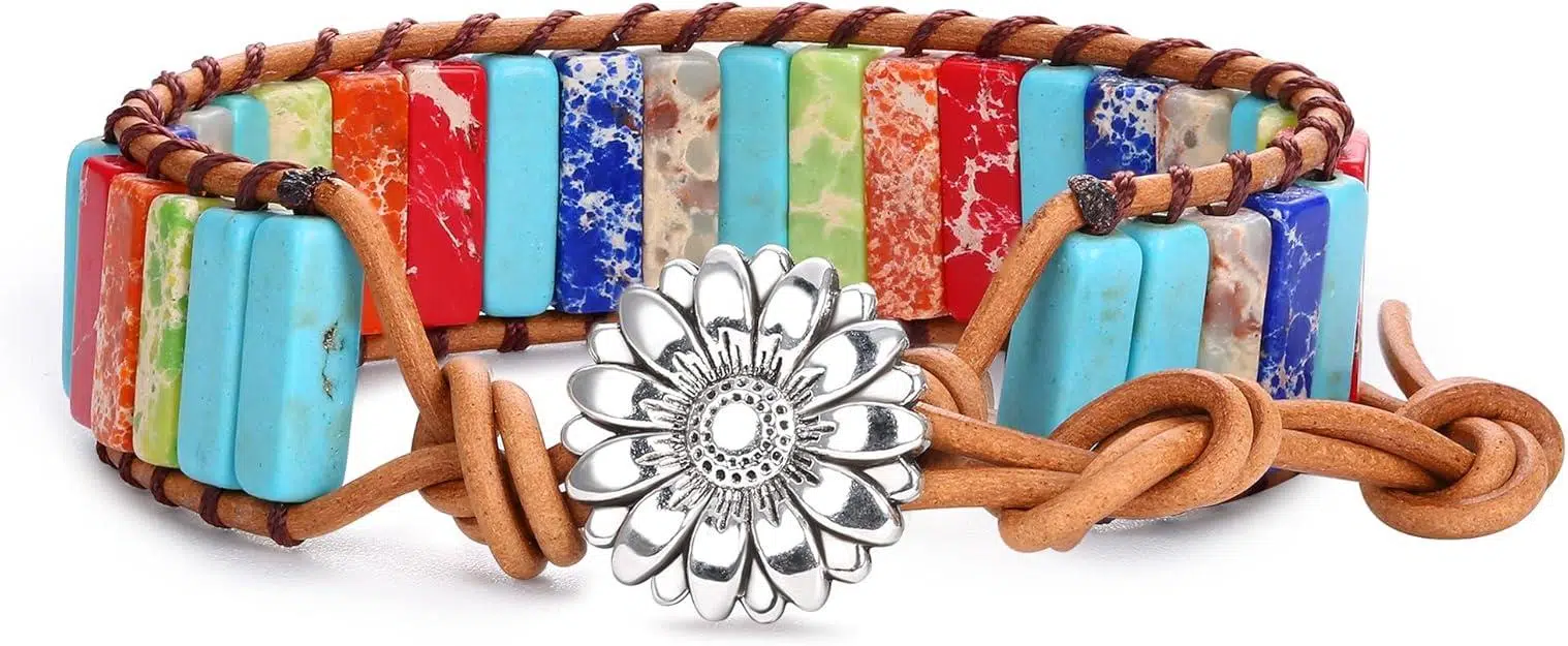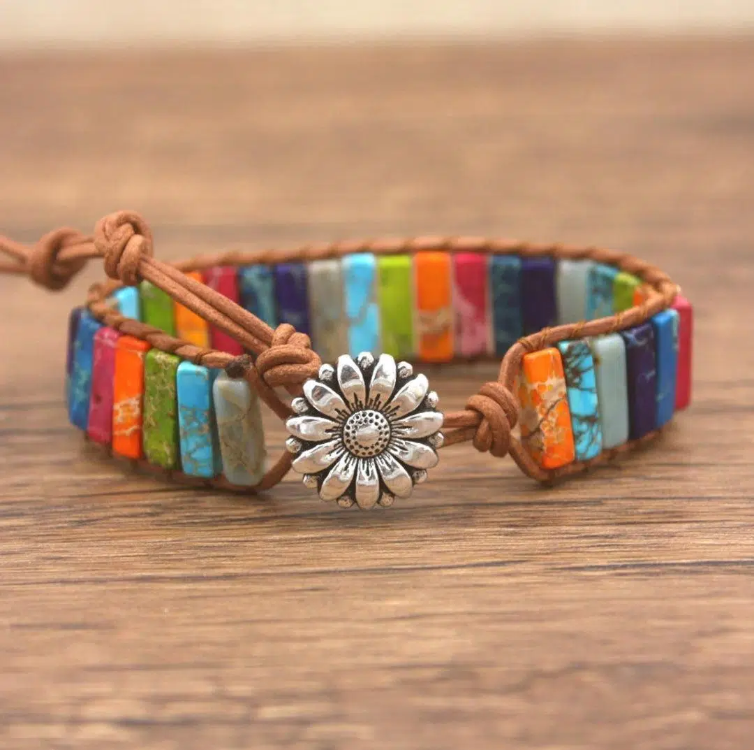 Valkyrie’nin tamamen el işçiliği ile hazırladığı bu doğal taş bileklik; renkli dikdörtgen taşların enerjisini, güçlü dokulu deri ip ile harmanlar. Merkezindeki özel çiçek figürlü metal düğme, tasarıma hem zarafet hem de bohem bir karakter katar.