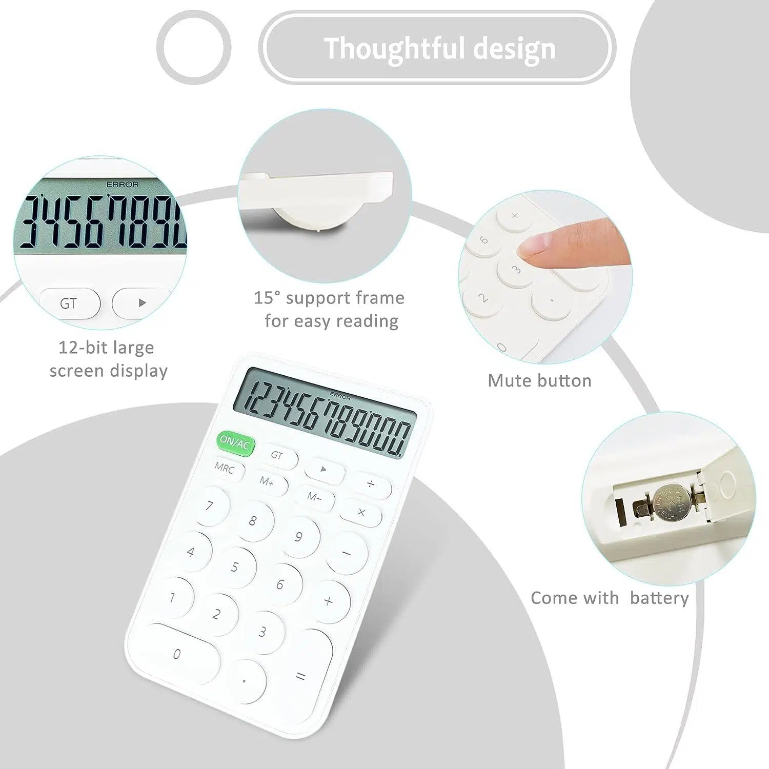 【Enerji Verimli Tasarım】Temel hesap makinesi ekranı, optimum görüş alanı ve stabilite için 15 ° eğimli ekranla tasarlanmıştır. Hesaplaması ve okunması rahat ve rahattır. Herhangi bir işlem yapılmadan 10 dakika sonra otomatik olarak kapanacaktır, enerji ve elektrik tasarrufu sağlar, lütfen unutmayın, estetik hesap makinesi paketi bir adet AAA pil içerir, geçici olarak güneş enerjisini desteklemez.