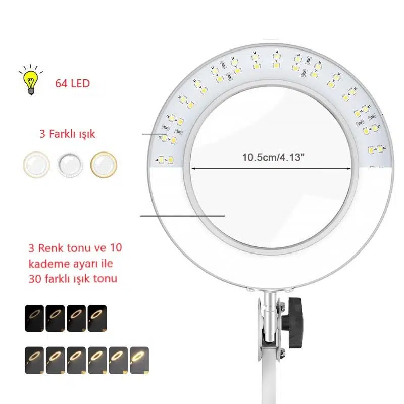 65 adet LED ışığı ile 3 farklı ışık tonu (beyaz, soft beyaz, gün ışığı) ve 10 farklı kademe ayarı ile 30 farklı ışık modu sağlamaktadır