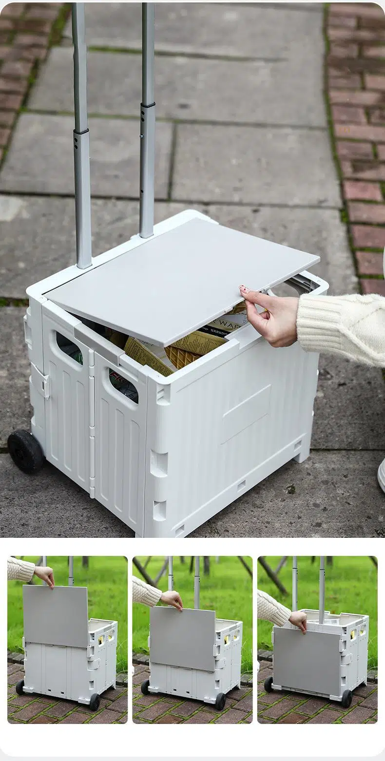 Valkyrie katlanabilir tekerlekli kutu; kapaklı tasarımı, iki tekeri ve alüminyum alaşımlı teleskopik çekme kolu ile alışverişte, pazarda, ofiste, piknik ve kampta pratik taşıma/organizasyon sağlar. Kaydırmalı takviye rayı ve katlanabilir kilit ile sağlam, kullanımı kolay ve yer kaplamaz.