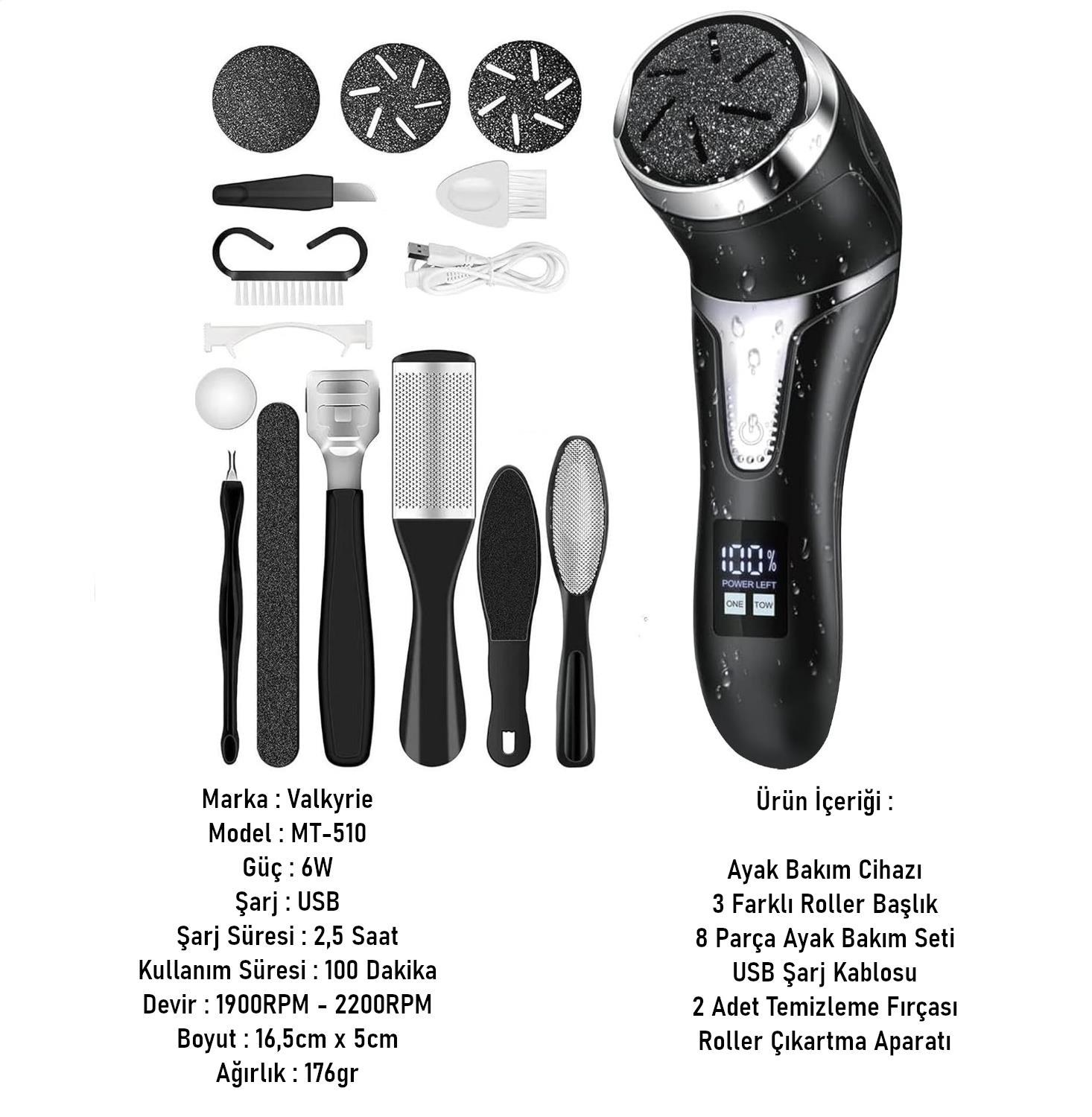 Etiketler | Valkyrie Profesyonel Ayak Bakım Cihazı 360° Dönen Başlık Dijital Ekranlı, Şarjlı & 10 Parça Pedikür Kiti Siyah |