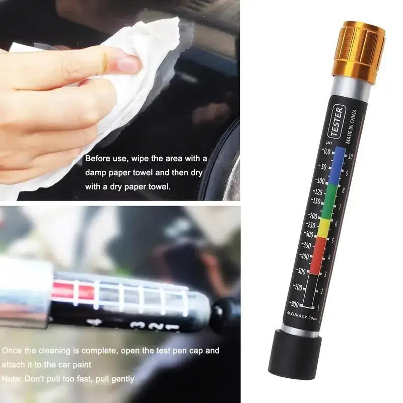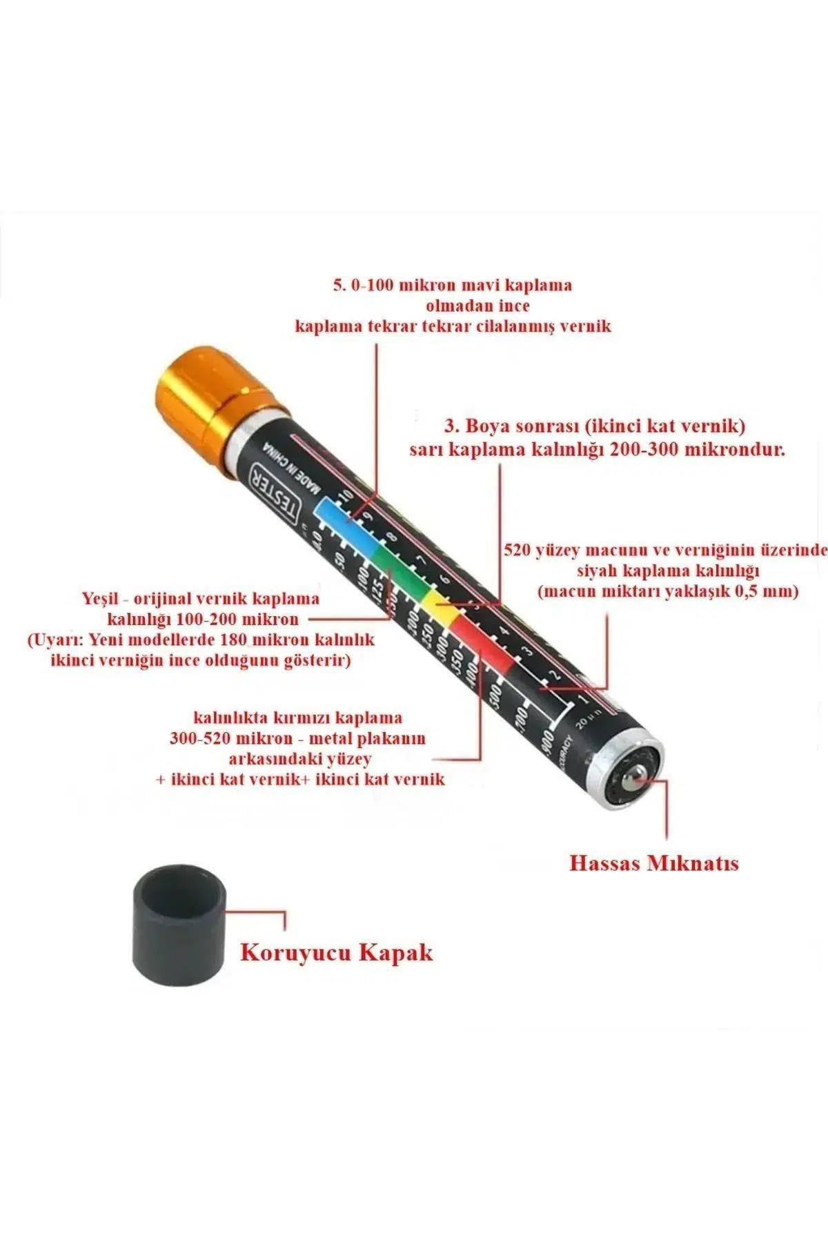 Özellik: Mikron cinsinden bir renk ölçeğine sahiptir. Manyetik uç ile, herhangi bir kavisli yüzeye veya ulaşılması zor bir yere yapışabilir. Vernik ve macunun kalınlığı, test cihazının ucuna test edilen yüzeyin mıknatısı ile dokunarak ölçülür (yüzey temiz ve tozsuz olmalıdır). Vernik kaplamalarının kalınlığını 20 mikron hassasiyetle ölçmek için. Aracın geçmişte boyanmış olup olmadığını hızlı ve hassas bir şekilde kontrol edin. Çelik sac ve galvanizli çelikten yapılmış araçlarda gözle görülemeyen boya katlarının kalınlığını tespit etmek için kullanılır. Pil gücü gerektirmez. Ince işçilik. Suya dayanıklı. Yüksek doğruluk ve güvenilirlik. Kullanımı kolay. Dayanıklı ve pratik. Ölçekteki bireysel renkler şunları gösterir: Mavi renk: 0.0 ila 100 mikron kalınlığında kaplama-Ince bir vernik (temel olmadan vernik veya tekrar tekrar cilalanmış) Yeşil renk: Orijinal vernikler için 100 ila 200 mikron kalınlığında kaplama. Uyarıdaha yeni araba modellerinde, 180 mikron kalınlık ikinci verniğin ince bir tabakasını gösterebilir. Sarı renk: 200 ila 300 mikron kalınlığında kaplama-Boyama onarımlarından sonra ("ikinci vernik"). Kırmızı renk: Sac metal onarımlardan sonra 300 ila 520 mikron kalınlığında kaplama + ikinci bir vernik. Siyah renk: 520 'den fazla yüzey macunu ve vernikli (yaklaşık 0.5mm macun miktarı) ile kaplama. Paket içeriği: 1 x boya kalınlık test cihazı| Stok Kodu | Thickness Gauge |