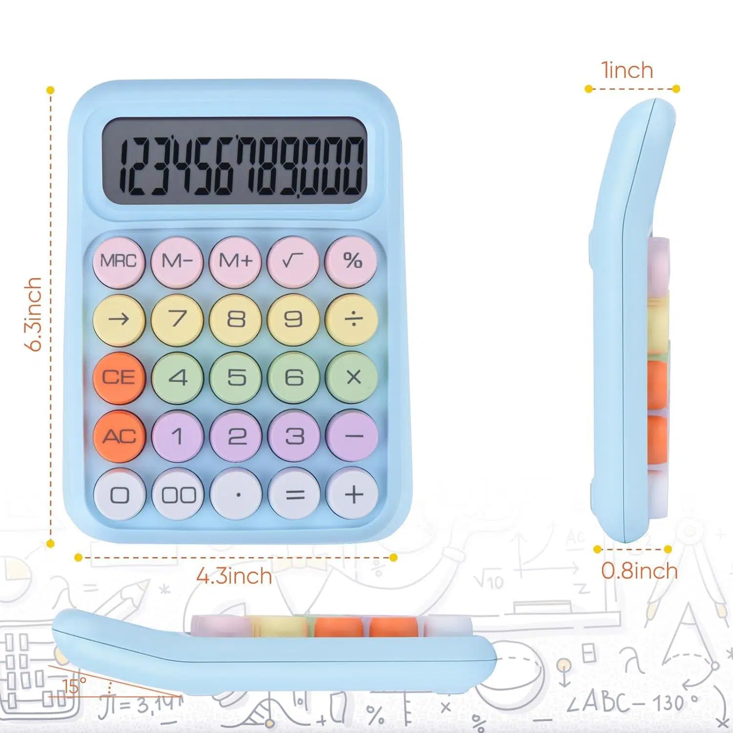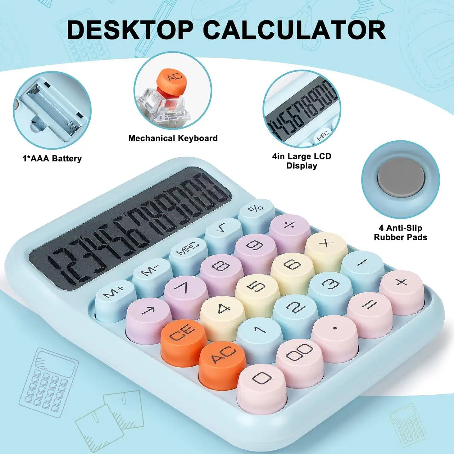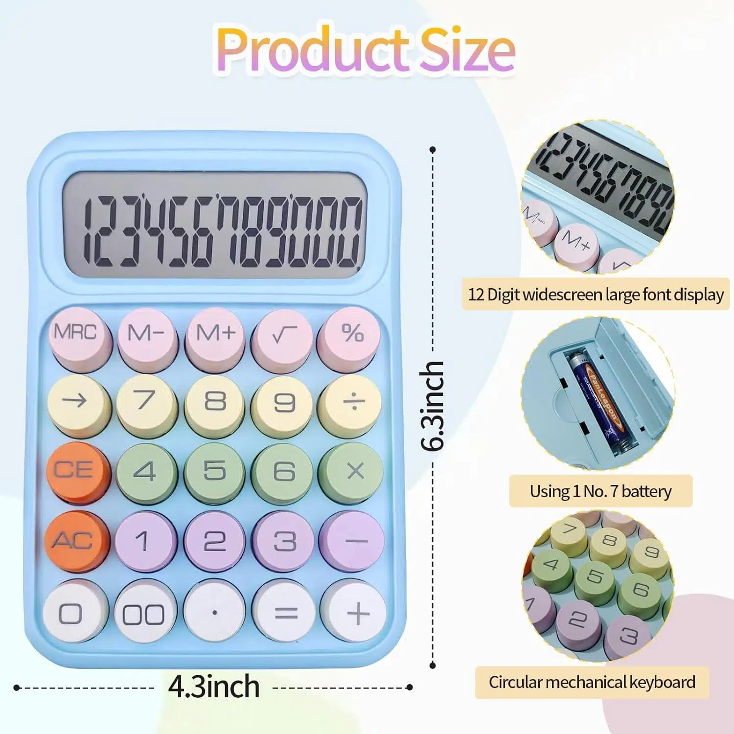 Renki, yuvarlak ve mekanik tuşludur. Büyük LCD ekranı 12 hanelidir. 1 adet AAA pil ile çalışmaktadır. 4 Fonksiyonludur. 10 dakika kullanılmadığı zaman otomatik kapanmaktadır. Ev, işyeri, ofis, okul kullanımı için uygundur. Pastel renklidir.