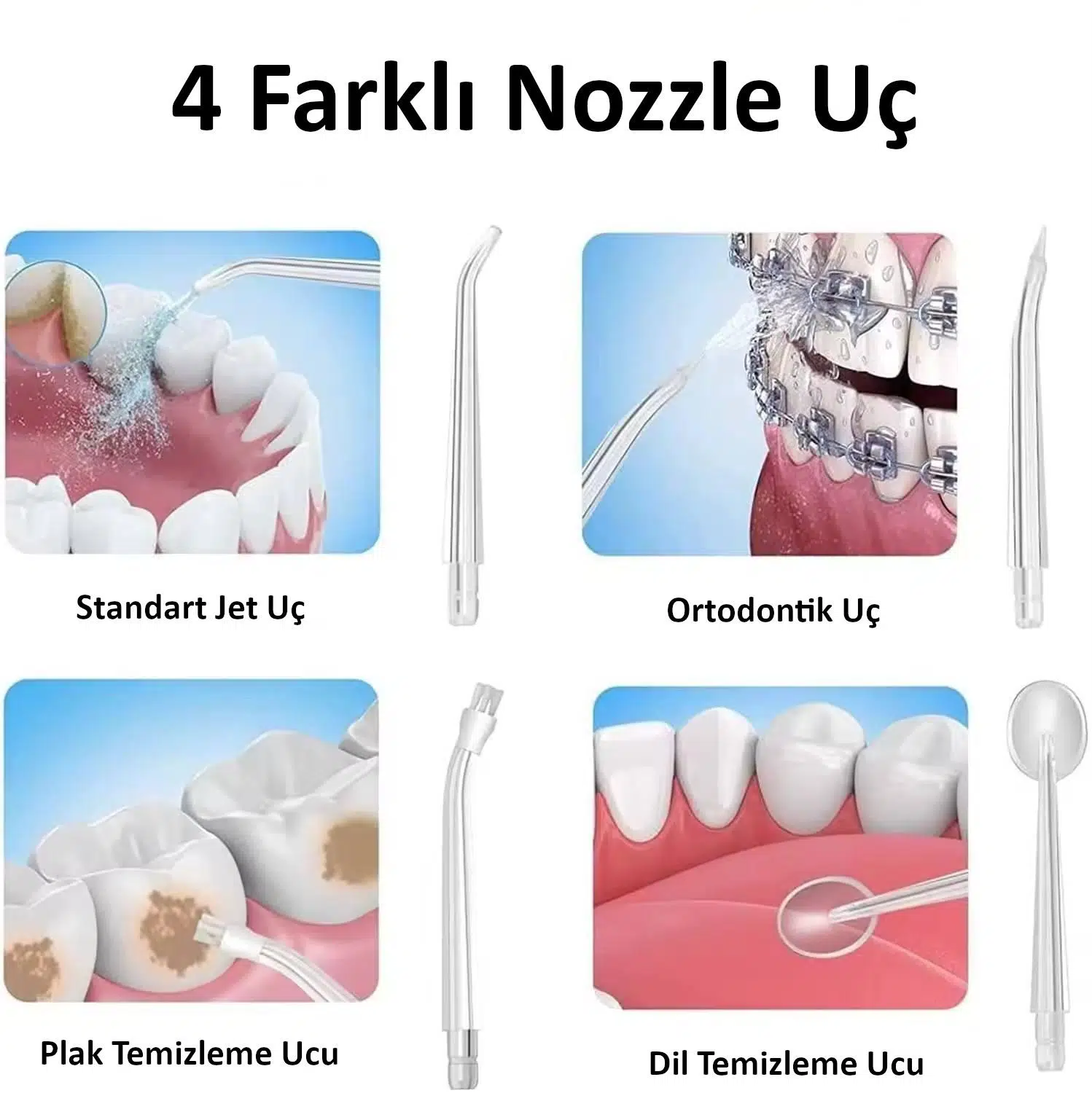 4 farklı başlık, yüksek basınçlı su püskürtme sistemi ve taşınabilir şarjlı tasarımıyla diş bakım rutininizi bir üst seviyeye taşıyın.