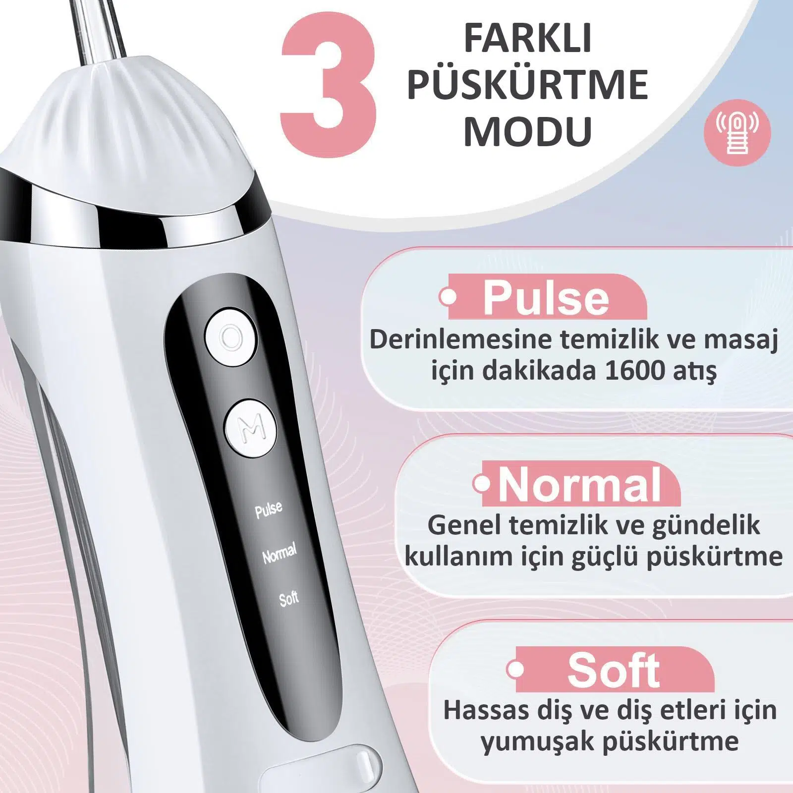 - 【4 Farklı Püskürtme Ucu Başlık】 Farklı amaçlarda kullanılmak üzere 4 farklı başlık ile gönderim yapmaktayız. Jet ucu ile tanzikli püskürtme sağlar. Ortodontik uç dağınık püskürtme ile farklı açılarda temizlik sağlar. Fırça uç diş plağı temizlemede ve engellemede etkilidir. Kaşık uç özellikle dil temizliğinde etkilidir.