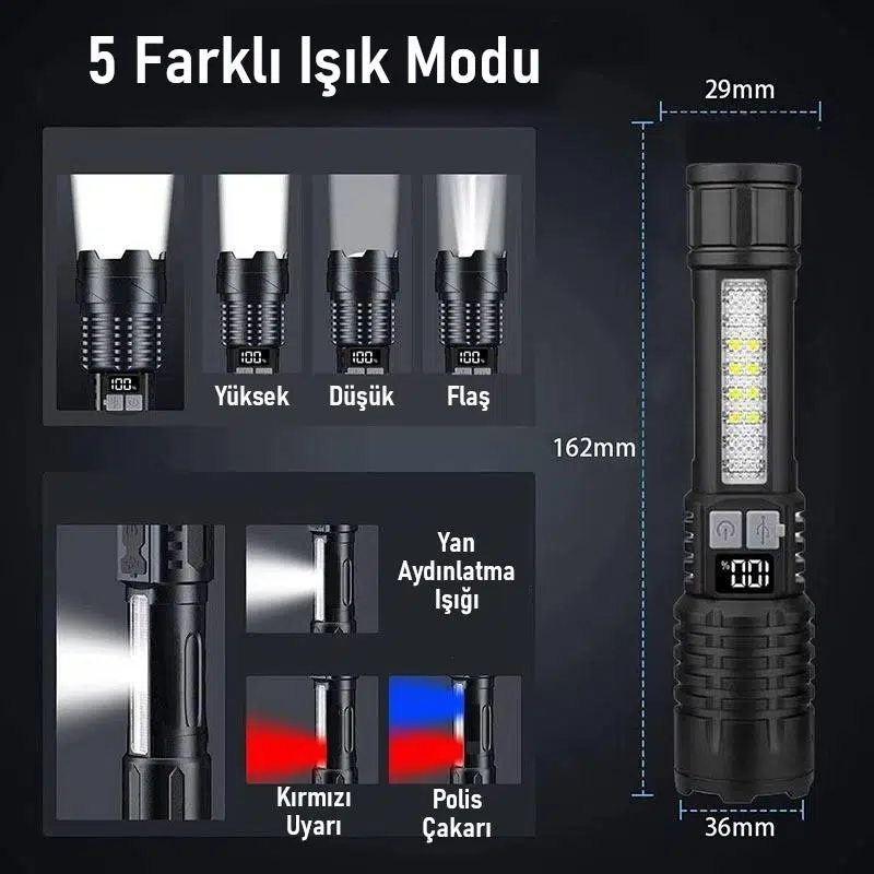 | Anahtar Kelimeler | Şarjlı el feneri, zoomlu fener, kamp feneri, led el feneri, acil ışık. |